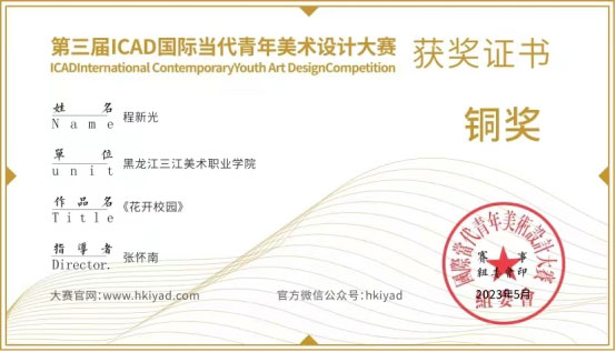 近日,2023 第三届ICAD 国际当代青年美术设计大赛(第一赛季 )评选结果揭晓,黑龙江三江美院师生获得银奖3项、铜奖7项,优秀奖10项。大赛共评选出金奖 18 件,银奖 571 件,铜奖 1322 件,优秀奖 2455 件。