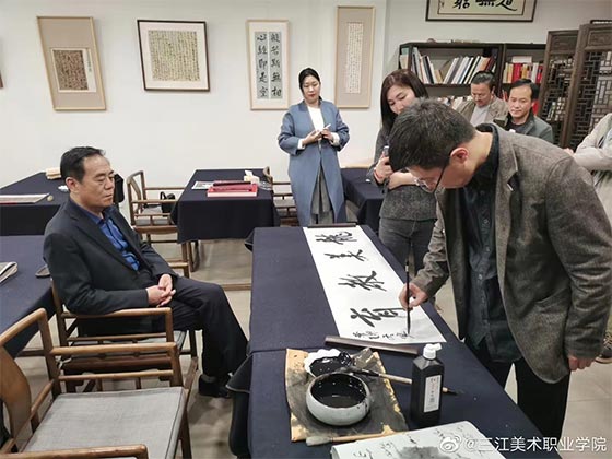 在大连围炉书院调研期间,手段我院校友、知名书法家、企业家、书院院长王冬寒的热情接待。王冬寒先生题写了“龙美教育”“龙美设计”“龙美书院”等6幅作品赠予三江美术职业学院。期间,大连校友会成员齐聚围炉书院,向王英海院长回报工作及生活情况。