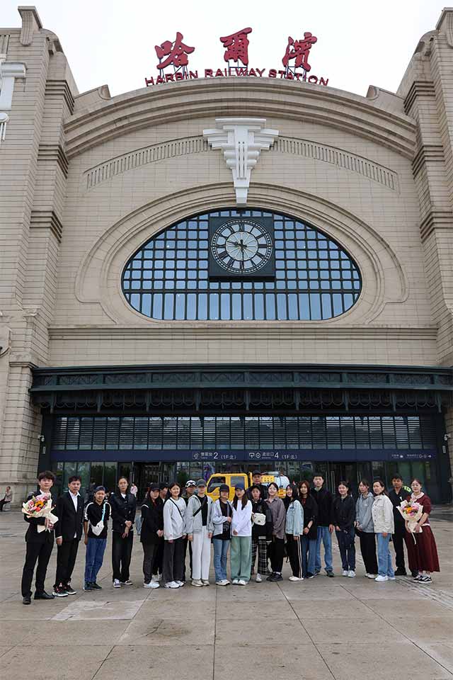 上午9时,俄罗斯留学生在巴图罗娃老师的带领下到达哈尔滨火车站。三江美院的老师们热情地迎接他们,并为他们献上了鲜花。这些俄罗斯留学生都是第一次踏上中国的土地,对哈尔滨这个“东方小巴黎”既欣喜又好奇,并在哈尔滨火车站合影留念。