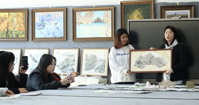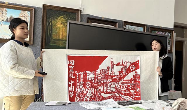 同样来自美术教育系的还有23美教4班陈磊、姚伊玟,23美教3班赵艺荣、刘金鑫,24美教班的陈佳、欧锡涵、王晨冉等人,她们分别带来了水彩画、山水画、漫画、剪纸等作品,绘画种类多种多样,展现了同学们乐善好学的创作精神。姚伊玟的剪纸作品主题是《同心共筑,中国梦》,篇幅较大,内容丰富,主题鲜明,更是将传统剪纸艺术与经典文学完美融合,让人不禁为其巧思与匠心赞叹不已。
