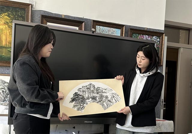 赵艺荣、刘金鑫的山水画作品是采用扇面的形式,画面内容丰富,山水树石都一一得当,画面上,山峦连绵起伏,以石青、石绿为主色调晕染而成的山体色泽明艳且浓郁,仿佛被赋予了蓬勃的生命力,在阳光照耀下熠熠生辉,尽显山川的雄浑壮丽。体现书画艺术的精神内涵。