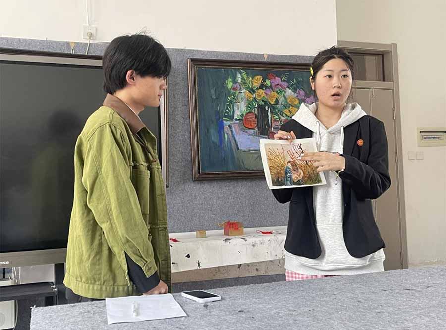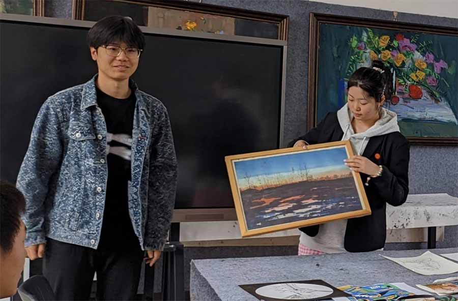 美术教育系 2024 级张浩然再次做客 “咖创屋”,带来画作《草间秘语》。他分享创作灵感时说,《草间秘语》捕捉自然环境中亲密而静谧的瞬间,以繁茂草丛为背景,营造隐秘而温馨的氛围。画面中人物姿态流露出情感交流,当我观察到露珠在草叶间折射阳光的样子,突然觉得自然本身就在诉说故事。我试图通过斑驳光影与人物微蜷的肢体语言,展现人与自然融合时的细腻情感。