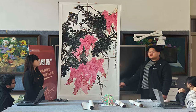 来自中俄联合教育学院的杨卫东同学带来的国画作品尤为惊艳,他说:“这幅作品,我是想把春日里紫藤瀑的热闹劲儿揉进笔墨里——你看这墨色的藤蔓,得用侧锋扫出老枝的苍劲,缠缠绕绕才像架下垂着的花瀑;那簇簇粉紫,是调了曙红和花青晕开的,要的就是浓得化不开的春味儿。枝头上那只鸟,我特意留了几笔淡墨的绒毛,让它往花影里一藏,像刚啄了花蕊,正等着风把花香裹过来呢。想让这满纸的花和鸟,能把看画的人也拽进这春日里来。”