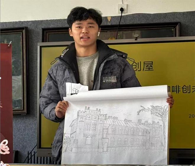 智慧建筑工程学院24环艺一班王海新同学展示了一系列手绘作品,其中《糖厂社区》是他重点介绍的作品,这幅作品是王海新同学在参与彩绘阿城活动时的创作成果,画面聚焦于老旧社区改造后的新面貌:墙上绘着生动的民俗壁画,作品采用写实的绘画风格,色彩温暖柔和,指导老师点评时称,这幅作品不仅体现了环艺专业学子扎实的专业功底,更传递出“艺术源于生活、服务生活”的理念,“让我们在画面中感受到了社区的变化与生活的美好”。