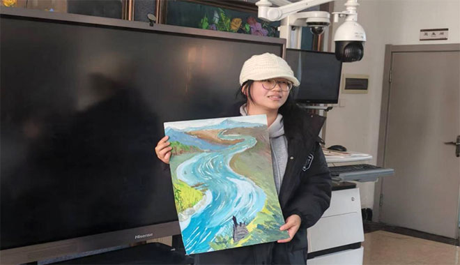 作品分享环节率先登场的是中俄联合教育学院杨卫东同学的国画作品《征流》,一亮相便赢得满堂喝彩。这幅以鱼为主题的作品,充分展现了国画的笔墨魅力——创作者以灵动的笔法勾勒出水流的蜿蜒姿态,画面层次感十足。杨卫东同学介绍,作品取名《征流》,是想借江河奔流不息的意象,象征当代青年不畏艰难、奋勇向前的精神风貌。评委在点评时表示,这幅作品既延续了传统国画的笔墨韵味,又赋予了作品鲜明的时代内涵,“是传统与现代的完美融合,展现了青年学子的艺术追求与责任担当”。