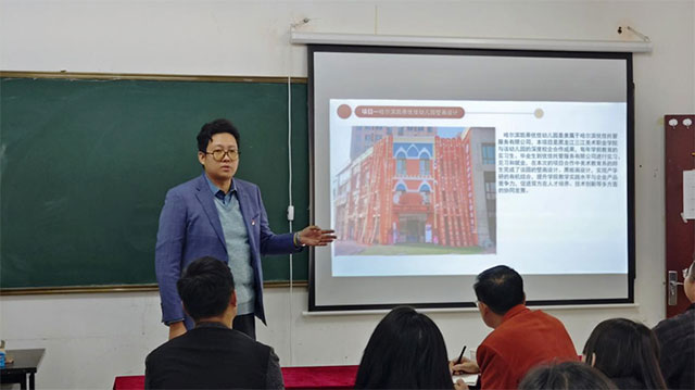 美教系就业办主任赵亮详细汇报了其负责的一系列项目,其中涵盖众多幼儿园内部的壁画设计、黑板报设计以及装饰设计等实践项目。这些项目不仅在艺术呈现上效果出色,更在项目教学实践中取得了显著成效,充分验证了项目式教学在实际应用中的可行性与优越性。