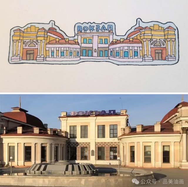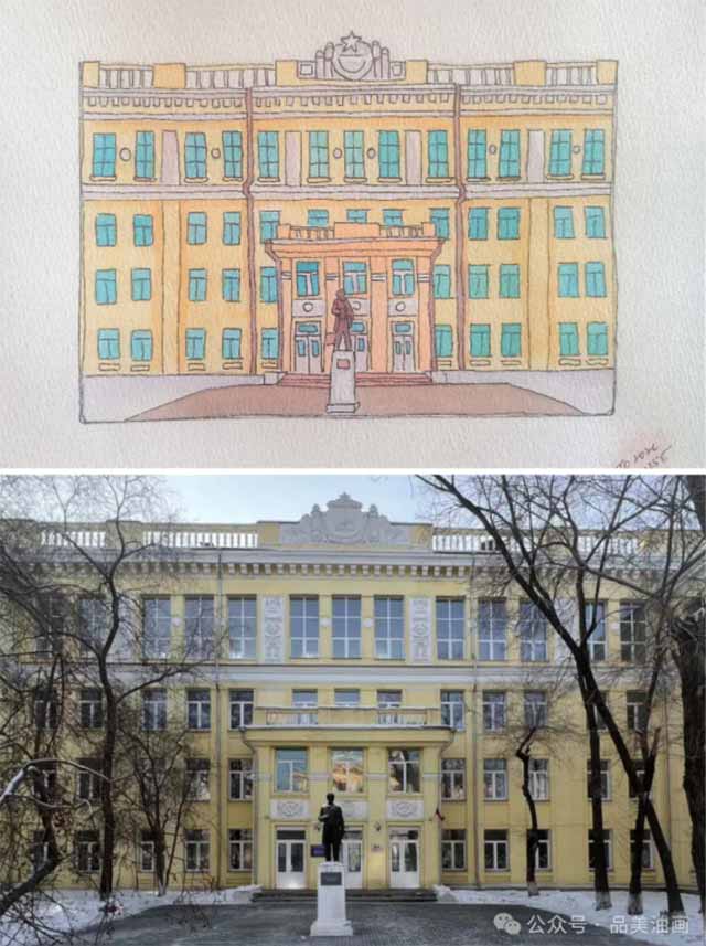 以后贝加尔国立大学的文化艺术系主楼为创作素材,有助于了解系部历史与人文精神,展示文化艺术系的内涵建设,同时也体现了赤塔的教育文化资源。