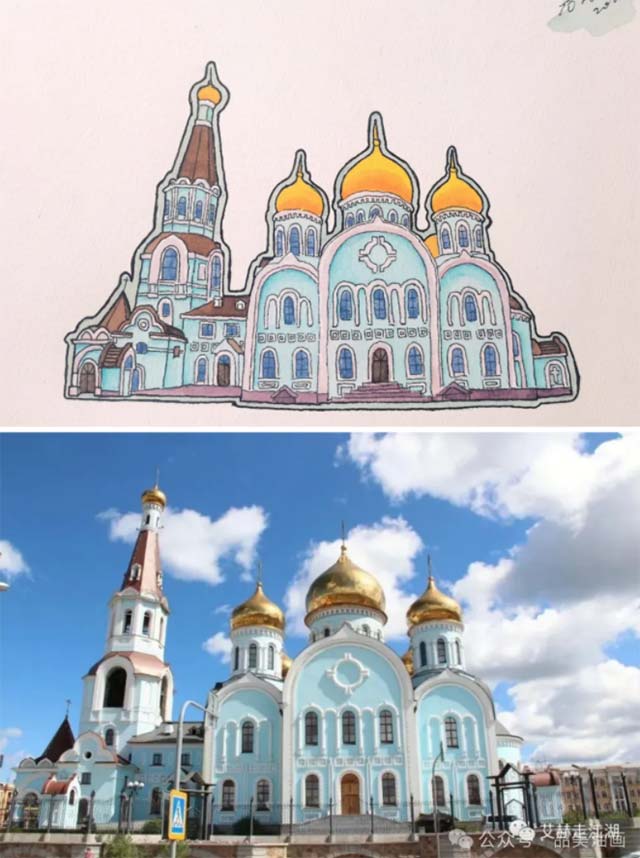 为了体现东正教堂的神圣与庄严,在设计中采用了平视捎带仰视的视角展示教堂的庄重性、正面化构图,突出教堂的洋葱顶、十字架以及精美的外建筑造型等元素。色彩上以金色、蓝色等东正教建筑中常见的色彩为主,营造出一种神秘而庄重的氛围。