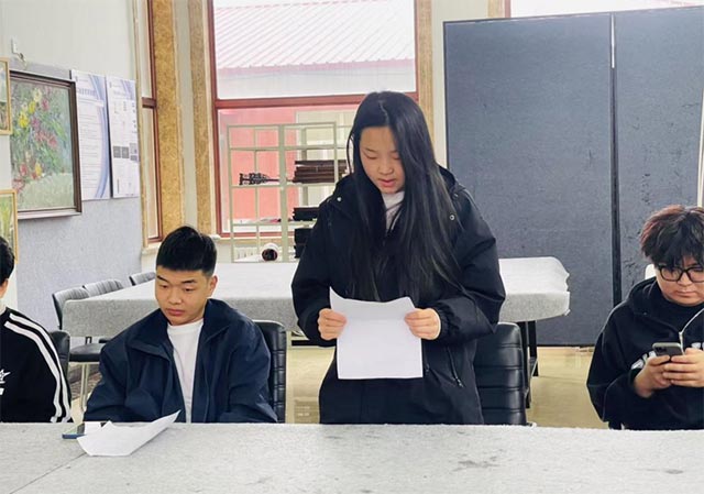 24环艺一班的张海微戴着班长职责进行了发言,她像拆解雕塑般剖开自己的管理工作。这位年轻的班级带头人没有回避问题,坦言自己在组织活动、凝聚班级时常常“慢半拍”,就像颜料盒里缺失的关键色,让整幅班级画卷不够鲜亮。“班长不是拿着考勤本的监督员,而应该是点燃集体热情的火种。”张海微用画笔作比,把管理漏洞具象成未完成的素描——当带头人缺席关键决策,班级齿轮就会出现卡顿;当动员号召不够及时,团队温度就会悄然流失。这番真诚到骨子里的反思,既让同学们看见学生干部肩头的重量,也展现出青年自我革新的勇气。