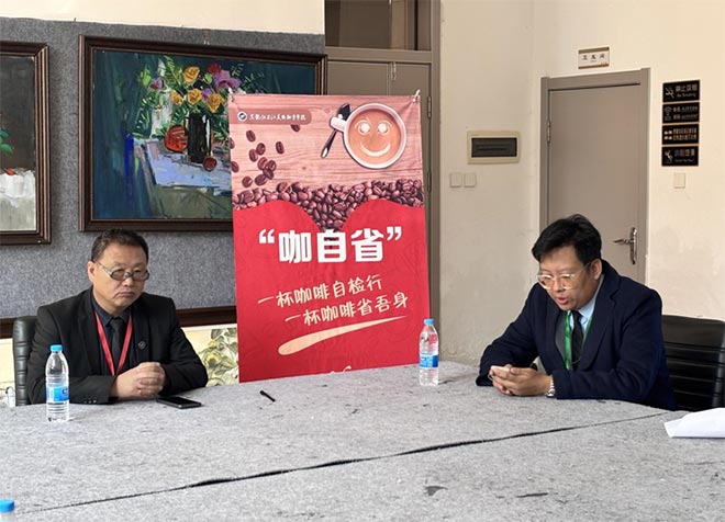 2026年4月11日,黑龙江三江美术职业学院第六十五期“咖自省”活动在哈尔滨教学实习基地龙美书院一楼如期举行。本次活动由艺术疗愈健康产业学院主任赵亮主持,督导室王俊波教授作总结讲话,来自各二级学院的学生代表齐聚一堂,共同分享学习生活中的感受。