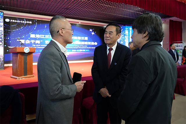 哈尔滨鑫时空科技股份有限公司董事长兼总经理殷平和哈尔滨南国鼎峰装饰工程有限公司市场部总监韩军代表参会企业代表先后作了发言。他们表示,三江美院在艺术设计领域具有较高的知名度和影响力,培养出的学生专业素养高、创新能力强。企业非常重视与三江美院的合作,愿意为学生提供广阔的发展空间和良好的工作环境。两位企业代表还介绍了公司的发展现状、业务范围、人才需求等情况,表达了与学院进一步深化合作的意愿,希望通过校企合作实现资源共享、优势互补,共同推动艺术设计行业的发展。