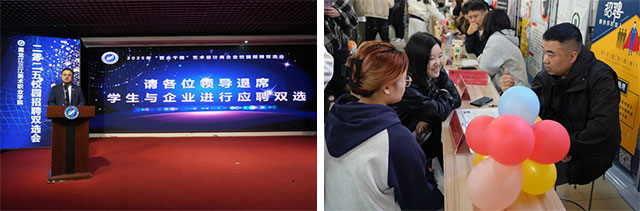 学院理事长、院长王英海教授,党委书记、省政府督导专员高明学及学院领导班子成员出席开幕式,并与企业代表一起按动双选会启动按钮。学院哈尔滨教学实习基地2025届毕业生参加双选会。