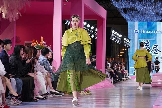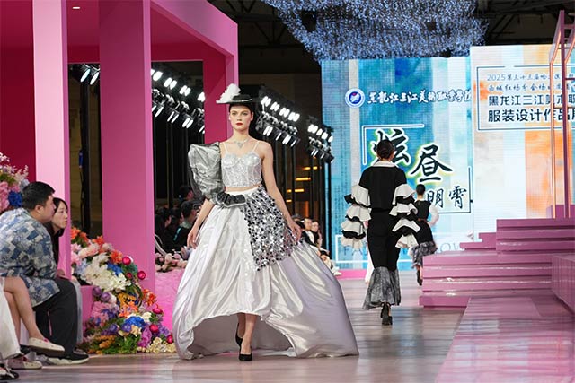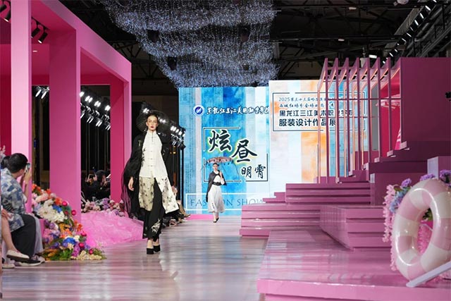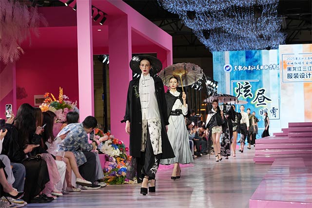 5月21日,黑龙江三江美术职业学院服装设计与工艺专业2025届大学生服装设计作品时装发布秀在哈洽会西城红场分会场璀璨启幕。