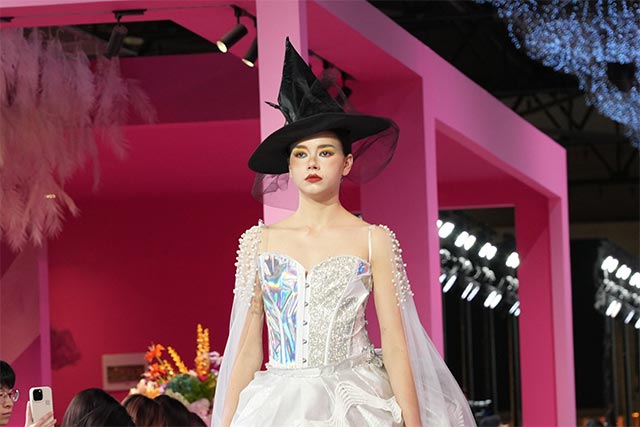 发布会现场,模特们身着学生设计的服装依次登台,从优雅的礼服到日常的休闲装,从充满东方韵味的中式服装到融合国际潮流的时尚单品,每一件作品都饱含着学生们的创意与心血。这些作品不仅在设计上独具匠心,更在色彩搭配与面料选择上展现出专业水准。色彩方面,既有清新淡雅的素色组合,营造出宁静、优雅的氛围;也有大胆鲜明的撞色搭配,彰显出青春活力与时尚态度。面料上,真丝、棉麻、皮革等不同材质相互碰撞,结合刺绣、印染、编织等传统工艺,呈现出丰富的质感与视觉效果。