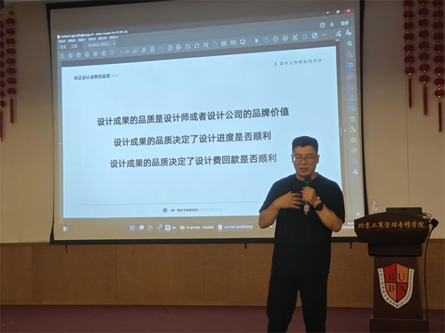 本次系列讲座的最后一场邀请到北京一墨一设计咨询事务所的创始人、总设计师席志宏,他讲座的题目是“设计协同方法”。席志宏结合该事务所的典型设计案例,为环境设计专业师生分析室内设计的流程,针对现阶段行业发展现状和岗位待遇等激励学生成为优秀的专业设计达人,重点强调学生将来就业要学会团队合作、高效完成任务的重要性。