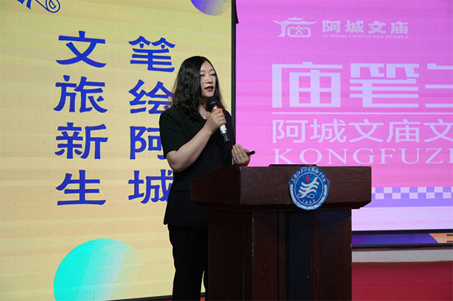 汇报活动第三个环节,设计与科技融合学院的王爱君老师,作为“文创优秀教师”代表,分享了她带领学生团队蹲点阿城文庙发掘文创灵感的经历及在课堂带领团队的经验,讲解了该组优秀作品,令人印象深刻的是他所提炼的核心品牌传播语“庙笔生花、庙不可言”,大家评论说堪称“庙趣横生”!其“金榜题名”IP系列衍生品,“小状元”IP系列衍生品,形态可爱,表情愉悦,萌感十足,令人好感倍增,陡增了很多期盼。这是王老师团队将乡土的文化印象通过艺术创作触发了更深层的精神需求,尤其是对当代青少年自我认知、心理归属和文化认同的探索。这种文创更接近于“用艺术语言构建身份认同的媒介”。这些作品必将成为游客可带走的“阿城记忆”。