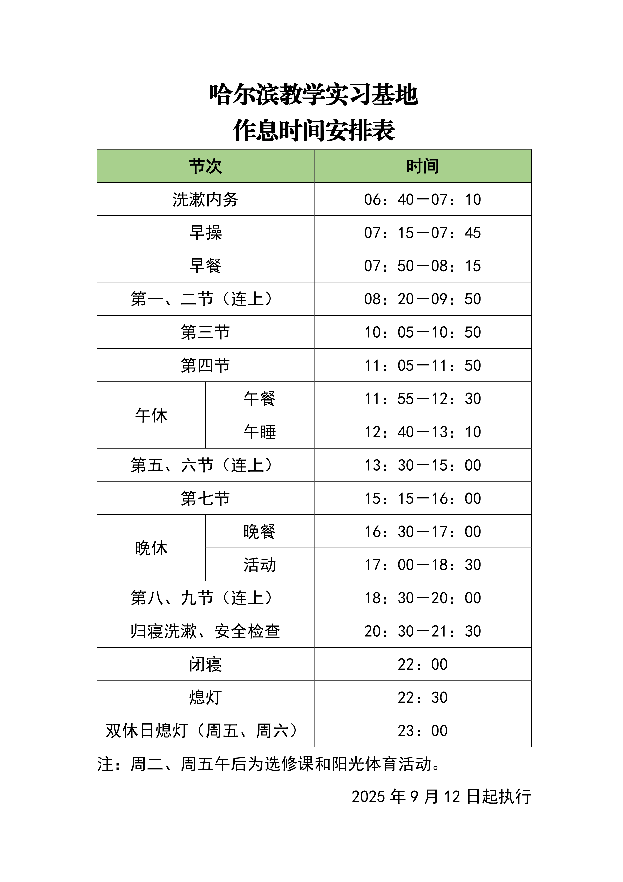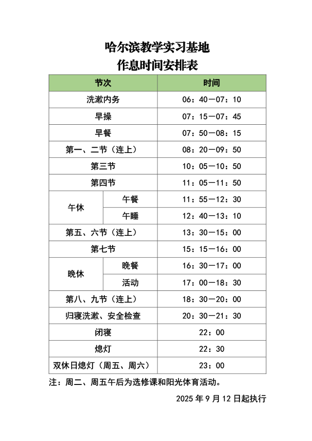 哈尔滨教学实习基地 作息时间表