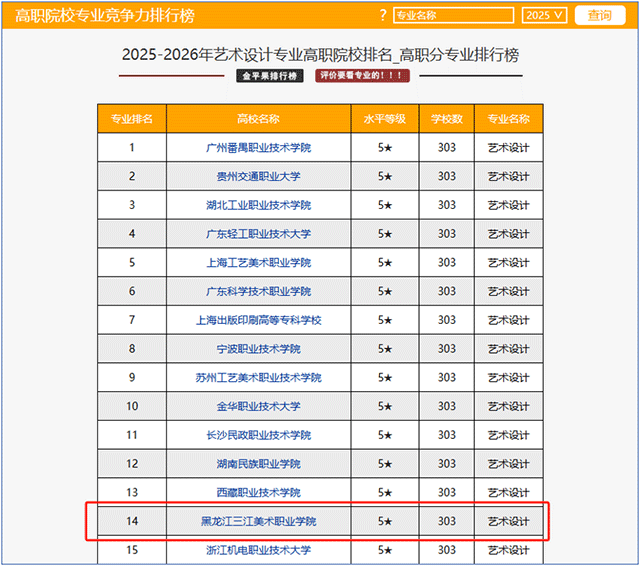 近日,金平果·中国高等职业院校专业竞争力排行榜正式揭晓,黑龙江三江美术职业学院多个专业表现卓越,再次荣膺黑龙江省第一名,全国排名持续跃升,充分彰显了学校在美术教育、艺术设计与科技、影视动画、智慧建筑工程等领域的领先实力与丰硕育人成果,生动诠释了学校“服务企业、服务社会、服务区域经济发展,培养能为用人单位创造价值的成品人才”的卓越成效。
