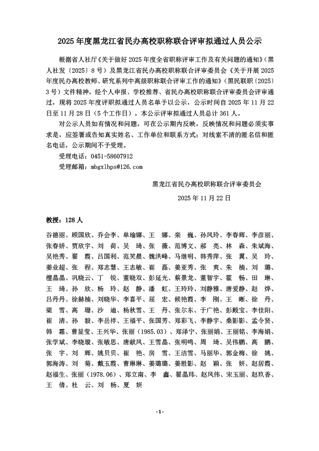 2025 年度黑龙江省民办高校 职称联合评审拟通过人员公示