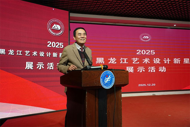 随后,张震甫会长代表主办单位致辞。他对黑龙江三江美术职业学院承办本次展览给予充分肯定。他指出,青年群体是我省设计创新的生力军,应当在专业教育、行业指导和创新实践中获得更多支持。省艺术设计协会将持续整合行业资源,为青年设计人才搭建展示、交流、成长的优质平台,让“新星奖”成为引领龙江青年设计风向标的重要品牌。