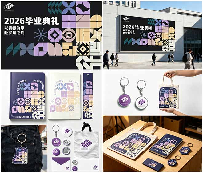 大赛分三大模块,限时创作、全程规范考核,全方位锤炼实战能力。模块一为毕业季专属品牌视觉符号,限时2.5小时,要求选手围绕毕业内核原创主视觉LOGO或符号,完成含标准制图、黑白稿、反白稿、标准色与辅助色的VI规范手册,考核情感共鸣、原创性、识别度、与学院精神契合度及规范严谨性。模块二为毕业季核心场景物料设计,限时2小时,基于统一视觉系统完成毕业典礼主KV、背景板、学位证书边框、毕业证书内页、拨穗仪式道具等仪式物料设计,考核品牌统一性、信息层级、仪式感及大屏输出适配性。模块三为毕业纪念文创与纸品设计,限时1.5小时,完成纪念册内页、邀请函、信封等纸品,以及帆布袋、T恤印花、钥匙扣、纪念徽章等文创产品,考核实用性、纪念价值、工艺合理性与成本控制。