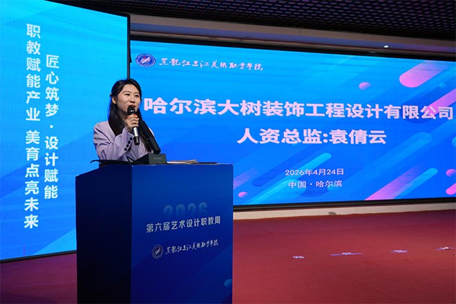 哈尔滨大树装饰工程设计有限公司人资总监袁倩云上台发言。他表示,离开校园十五年后再回母校,倍感亲切与幸福。从校园踏入社会后,每一次选择都至关重要,找工作如同找对象,是一个双向选择的过程,需综合考量环境、口碑与发展空间。他介绍,大树装饰成立于2015年,至今已有十余年发展历史,是哈尔滨装修行业深受百姓信赖的品牌,市场占有率极高,新小区进户时随处可见公司窗贴广告。目前企业正招聘设计助理与销售类岗位人员,欢迎环境设计、市场营销及其他专业感兴趣的同学前来咨询。她祝愿三江美院桃李芬芳、薪火永续,也祝愿每位同学在人生十字路口做出适合自己的选择。两位企业代表的发言赢得全场阵阵掌声,充分体现了用人单位对龙美人才培养质量的高度认可。