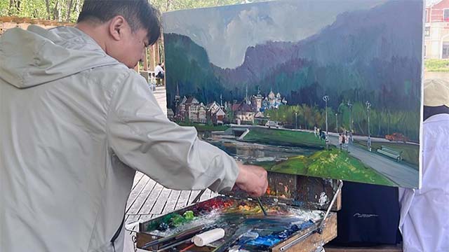 作为油画协会主席,画家刘恒伟在写生时展现出深厚的艺术积淀与创新魄力。他支起画架,目光如炬地凝视着眼前起伏的山峦与金龙山特色建筑,将构图、光影与色彩在脑海中反复推演。他时而后退几步,眯起眼睛审视画面的整体关系;时而疾步向前,用笔果断塑造山体的肌理。“金龙山的每一寸土地都充满生命力,笔触必须跟随自然的节奏跃动。”刘恒伟坦言,创作过程中,他力求打破传统风景油画的桎梏,通过大胆的色彩碰撞与块面重组,让画面既保留自然本真,又彰显现代艺术的张力。