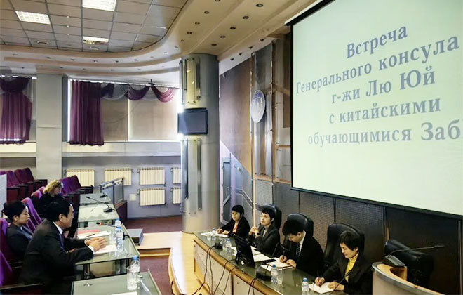 ▲驻伊尔库茨克总领事刘渝会见王英海校长及在俄中国硕博留学生