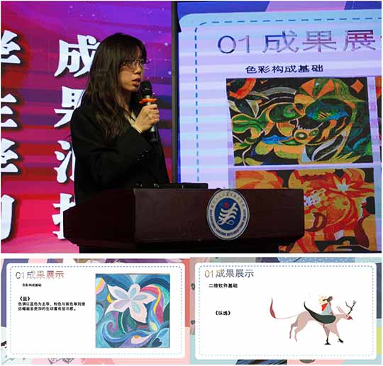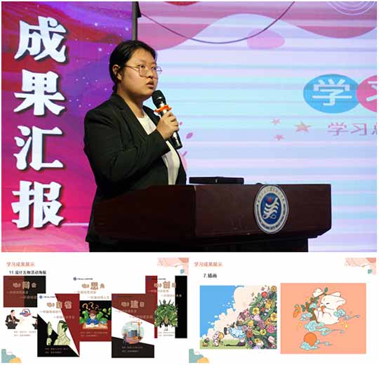 数字传媒系参与汇报的是张峰源和丛佳怡,在汇报中张峰源同学体现了个人在学习方面的钻研精神和认真态度,无论是网页设计、平面绘画,还是包装设计、书法作品,每一件作品都有着自己的独特风格。