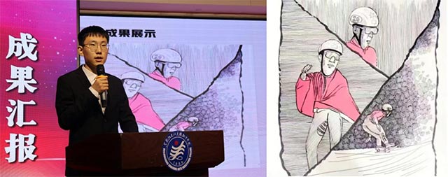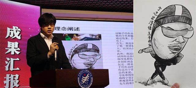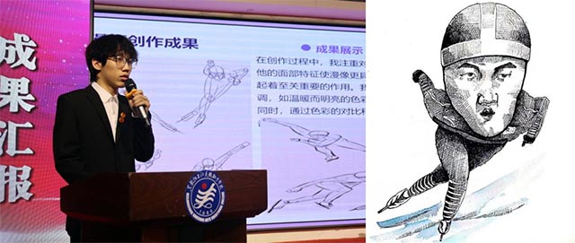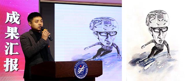 首先登台的是在21届漫画双年展中荣获金奖的美术教育系主任郭勇老师,他首先对自己作品《武大靖漫像》的创作背景与创作目的进行了分享,其次对作品创意与创作过程进行讲解。他说,之所选择武大靖作为漫画原型,是因为武大靖是中国短道速滑队的优秀运动员,他不仅是中国男子短道速滑500米记录的保持者,同时也是世界短道速滑500米决赛的冠军,武大靖在国际赛场上为中国夺得了许多奖杯,他的表现值得每一个中国人敬佩,所以想通过这幅作品传承并弘扬武大靖的冰雪体育精神。