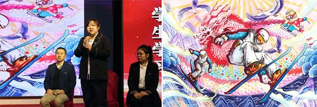 环境艺术工程系的马蓉老师在座谈会上展示了她的作品《冬韵龙辉》。作品选用两名滑雪运动员为主角,以富有活力与热情的方式飞速驰骋,运动员身后以代表中国力量和中国图腾的红色巨龙为背景,增强了视觉效果。为增强画面的生动性,还增加了大雁环绕在巨龙身边,以及可爱的妮妮和运动员们一同跳跃的动态画面。借助光影,在背景上添加了金色的线条,使整个场景更加明亮,营造出活力四射的美感。通过她的分享,学生们不仅领略了艺术作品的深层含义,还深刻理解了如何将创意与实践相结合,并从中汲取了宝贵的创作经验。