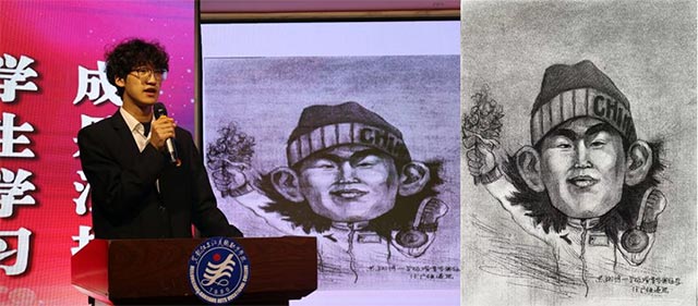 中俄3+1班的陈俊宇同学展示了他的获奖作品《高亭宇漫像》。这幅作品不仅展现了他在漫画创作上的非凡才华,还承载着他对梦想不懈追求的精神。他从最初学习漫画基础知识开始到构思独特故事情节以及精心绘制每一个细节,直至最终完成这幅充满创意与激情的作品,每一步都凝聚了陈俊宇大量的心血和汗水。通过分享自己的创作历程,他希望能够激励身边的每一个人勇敢地追寻自己的梦想与目标,不畏艰难险阻,勇往直前。