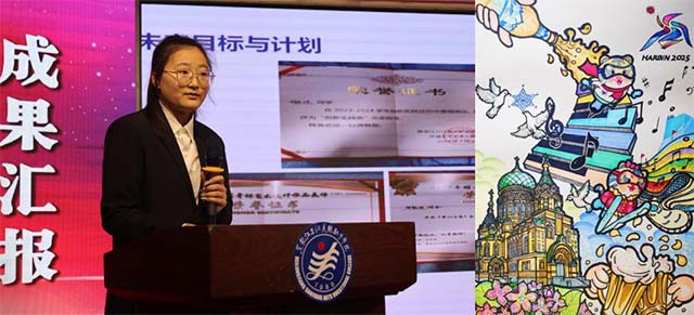 23环艺4班,周铁妹同学展示了她的获奖作品《雪舞冰城》。这幅作品不仅展现了她在艺术创作上的才华,还蕴含了深厚的文化内涵。她分享说,该作品的创作灵感来源于亚冬会吉祥物滨滨妮妮、索菲亚教堂、哈尔滨大剧院等哈尔滨代表性的标志物,通过细腻的笔触和丰富的色彩,将冰雪运动的魅力与亚冬会的精神完美结合,呈现出一幅生动活泼的画面。同时,周铁妹也对自己的未来进行了规划,她表示将继续深入学习环境艺术设计,努力提升自己的专业技能,为未来的职业生涯打下坚实的基础。