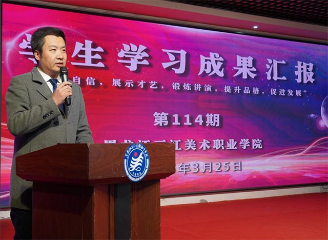 第114期学生学习成果汇报由数字传媒系主任王艺夫主持。艺夫老师帮助同学们全程开展多轮汇报演练指导,从选题策划到展示设计,从讲稿打磨到舞台呈现,参与汇报的学生在系统化备展过程中实现专业认知迭代。经反复淬炼的汇报内容较彩排阶段更具表现张力,彰显出三江美院"展教融合"培养模式对艺术人才综合素养的塑造效能,为学子职业生涯发展奠定坚实根基。