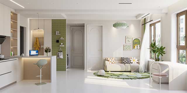 暑期实践中,她在指导教师宿宝丽的带领下,与宁安市江峰建筑安装有限公司合作完成一项小户型设计项目。方案以“通透联动”为核心理念,采用开放式布局串联客、餐、厨、卧空间,整体以浅色调勾勒出轻盈温馨的轻法式风格。细节处理上,嵌入式柜体与厨房中岛吧台兼顾美观与实用,卫生间则通过干湿分区、一体化台盆及智能设备配置,进一步强化功能与美学的统一。