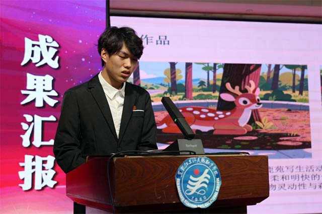艺术疗愈与人工智能学院24级美教班曲博文,以“寒地文创绘本龙江”为主题,汇报了黑龙江省四季非遗购物周文化衍生品项目落地成果。项目在孙作范教授与郭勇主任指导下开展,期间与全国14个省、2个直辖市的60位非遗代表性传承人及相关企业合作,同步售卖四季非遗作品,探索“非遗工艺+地域生活场景”的文创转化路径,最终实现项目口碑与销量双丰收。