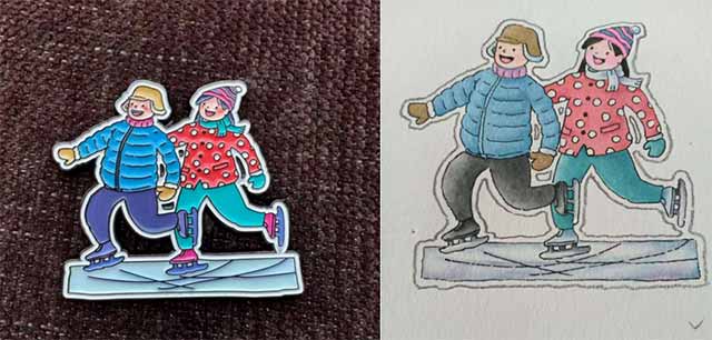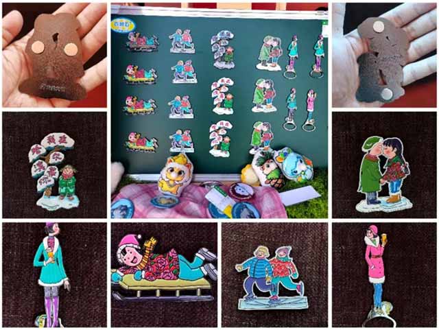 两款冰箱贴紧扣黑龙江“冰雪文化+地域风情”:冰雪滑冰主题款还原冬季冰雪运动场景,以明快色彩传递北方活力;冬日情侣主题款借细腻服饰与互动设计,展现东北冬季温情。均融入非遗工艺质感,兼顾审美价值与人文共鸣。项目通过“规模化生产保供货+非遗工坊手工赋能+冰雪大世界场景化营销”闭环推进,首批备货3天售罄,后续追加产能仍高复购,成购物周“非遗文创类”销量第一。此外,曲博文同学还有多个作品在省级展览亮相。