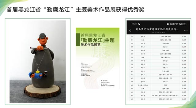 此次汇报中,李雨彤同学两项亮眼成绩尤为引人注目:作品《摆布》在首届黑龙江省 “勤廉龙江” 主题美术作品展中斩获优秀奖,以艺术语言传递勤廉正能量,展现了青年学子对社会主题的深刻理解与精准表达;阿城文创作品 —— 玉泉酒厂冰箱贴成功入选首届黑龙江省高校青年教师、学生美术教育成果展,将地域文化元素与实用美学巧妙结合,让文创作品成为承载本土记忆的鲜活载体。这两项荣誉的背后,凝结着李雨彤同学对艺术的热忱匠心与不懈探索,是她将专业学习与主题表达、文化传承深度融合的生动写照。