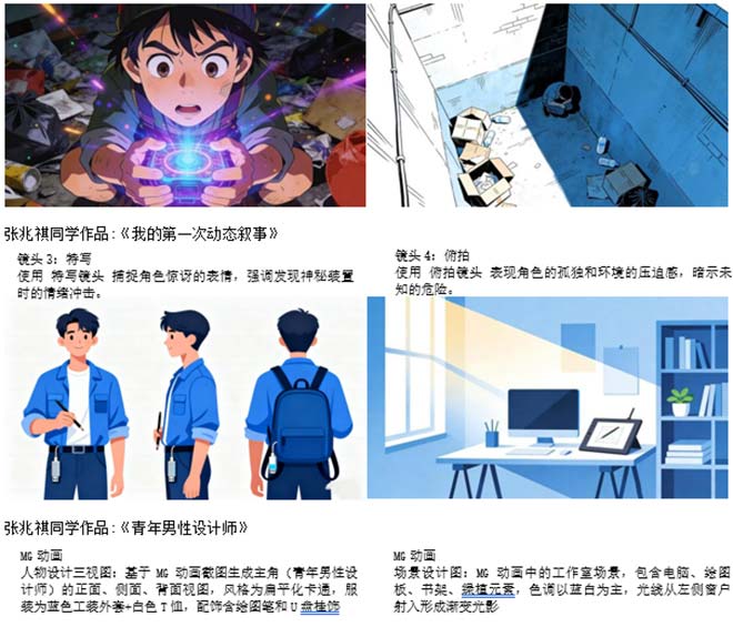 张兆祺同学担任24动画2班班长,在班级管理中展现出较强的责任意识与组织能力。专业学习上,他参与创作的电信反诈MG动画入选黑龙江省首届动漫作品双年展,并荣获设计新星一等奖、国青杯等多项荣誉。更难得的是,他能够清醒地认识到自身在“人体结构、场景叙事、软件深度”等方面的技术短板,并制定了切实可行的改进计划。这种自我反思与进取精神,正是其不断进步的内在动力。