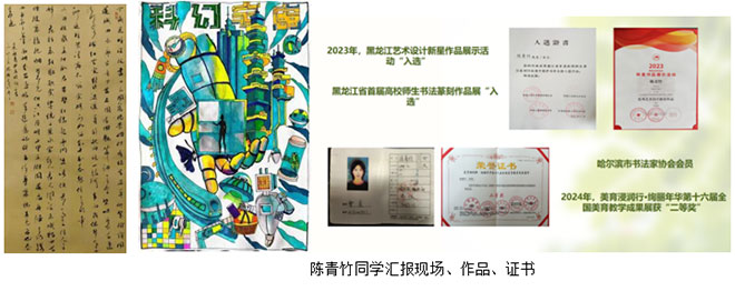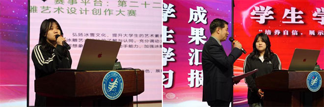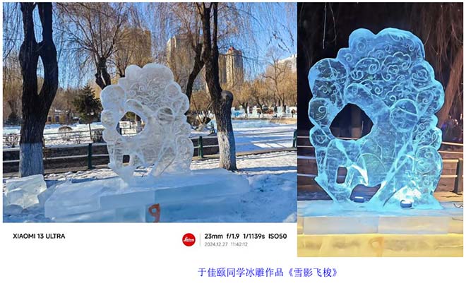 在专业实践中,于佳颐同学勇于挑战自我。在第二十二届黑龙江省大学生冰雕艺术设计创作大赛中,她凭借作品《雪影飞梭》荣获优秀奖,评委评价其“创意融合度高、技艺精湛”。