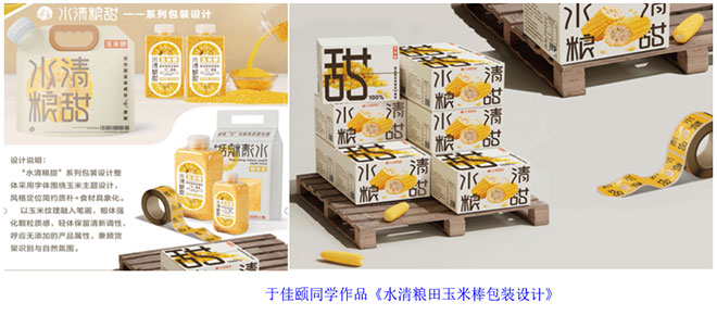 于佳颐同学的包装设计作品《水清粮田玉米棒包装设计》体现出独特的设计思考——她跳出“只关注画面好看”的误区,转而从“消费者怎么看、产品怎么用、市场怎么认”三个维度进行创作。例如,“字体+纹理”的设计本质是解决让消费者快速识别产品属性的问题;多形态包装则对应不同场景下的使用需求。此外,她还尝试将更多食材的天然属性转化为更生动的视觉语言。