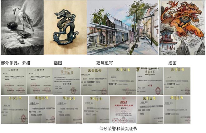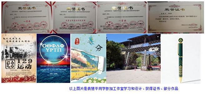 袁慧平同学来自设计与科技融合学院。在学习中,她始终保持严谨踏实的态度,课堂专注认真,作业完成质量高,养成了良好的学习习惯。她性格文静内敛,做事细心沉稳,待人真诚。在专业实践方面,她积极参与工作室项目,不断积累设计经验,其作品多次获得认可。以上图片正是她参加工作室学习与设计实践、收获各类证书以及部分代表作品的集中展示。