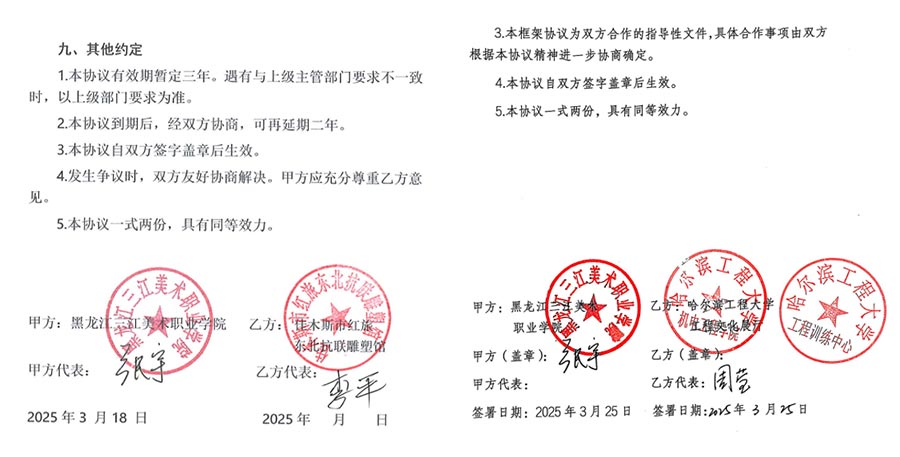 近日,按照省教育厅的部署,经友好协商,我院与哈尔滨工程大学文化展厅和东北抗联雕塑馆建立“大思政课”实践教学协作共同体,双方签订了相关协议。