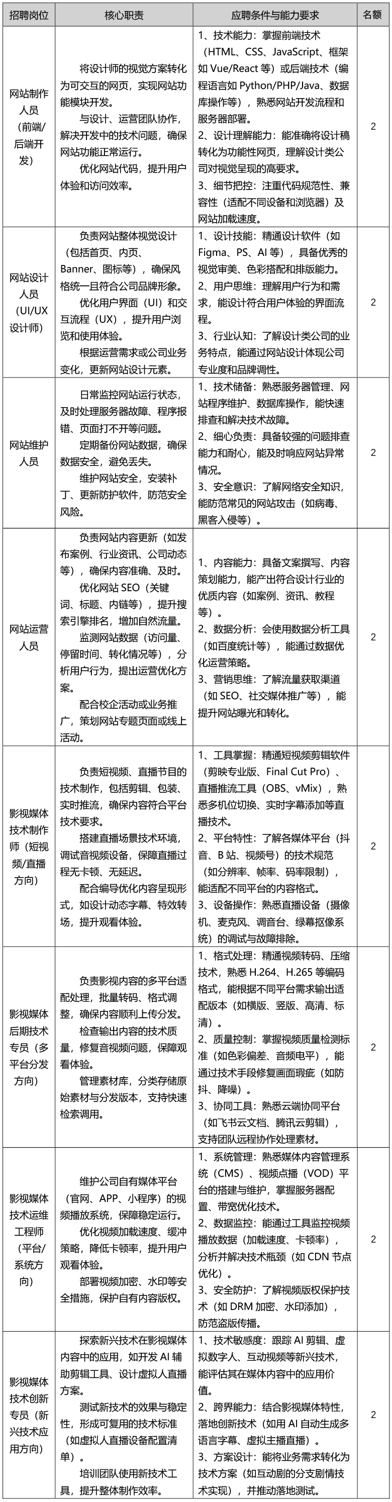 四、具体招聘岗位与相关要求