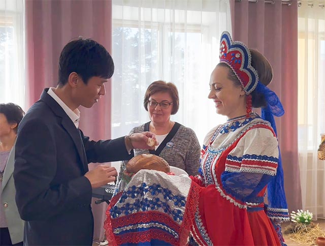 课程结束后,一场充满文化氛围的音乐会将此次交流活动推向了高潮。俄罗斯后贝加尔地区寄宿中学师生以传统习俗“面包沾盐”盛情款待我院教师团队,尽显两国人民深厚的友好情谊。音乐会上,俄罗斯小朋友们的欢快舞蹈展现了俄罗斯民间艺术的独特风采,而三江美院赵子豪老师的一首动听的歌曲,更是赢得了在场观众的阵阵掌声,将现场气氛推向了高潮。