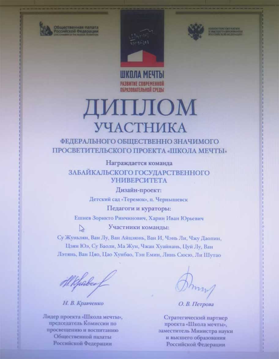 Творческая команда во главе с преподавателями Забайкальского государственного университета Есиевым Зоркито Линчиновичем и Харлином Иваном Юрьевичем, Вместе с преподавателями Саньцзянского художественно - профессионального института Хэйлунцзян, которые едут в Россию для учебы, Су Жунлян, Ван Лу, Ван Айцзюнь, Ван И, Чэнь Ли, Чжу Даопин, Су Баоли, Ма Рон, Чжан Хуайнань, Цуй Лу, Ван Лэтянь, Ван Цзяо, Цао Хунбао, Тен Имин, Линь Сюйшэй, Ли Шутао и его окружение, посвятили себя местному далеко идущему социально значимому проекту « Школа мечты» и нарисовали великолепное изображение маленьких детей в городе Чернышевке. Проектные чертежи.