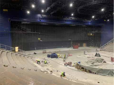 王经理还带领师生们参观了餐饮馆。餐饮馆建筑面积近15000 平方米,设置近百个点位店铺,规划各种餐饮品类,在保障景区四季餐饮需求的同时,延伸打造夜场娱乐业态。目前餐饮馆内电音区正在进行精装施工,电音区水磨石地面已铺贴完成,舞台正在拼装施工。