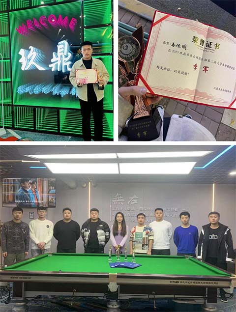 今年12月份,2022级环艺2班姜佳明同学,在 “2023 玖鼎乔氏台球俱乐部第二届大学生争霸赛”中荣获季军;2023级环艺1班黄超同学,在“奥秘李斯球杆·2023乔氏杯”大学生中式台球比赛”中获得了第12名,并获得700元的奖金。