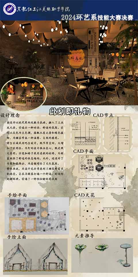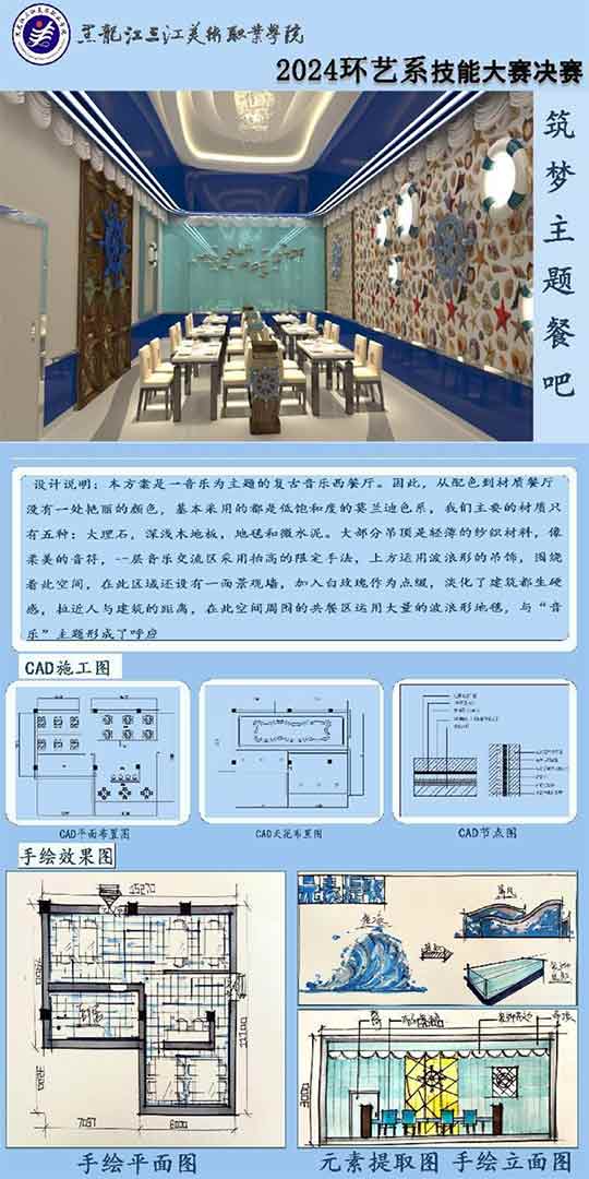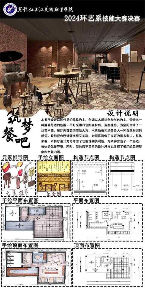 室内设计大赛决赛以国赛赛项内容为基准,赛题以“200平方米大学生主题餐吧”为比赛素材,以国家专业教学标准、现行国家规范和行业标准、企业用人要求为依据,以企业技术工作岗位的综合设计核心工作任务为驱动,构建从草案设计到效果图、施工图绘制并包括材料清单编制和竞赛总结与展示的完整工作流程。设计竞赛模块之间、模块任务之间层层递进,环环紧扣。根据提供的赛题素材,参赛4人团队相继完成“专业基础及手绘构思设计方案”、“效果图、施工图绘制”、“竞赛总结与展示”三个竞赛模块共计4个任务内容。竞赛时长为3.5小时。