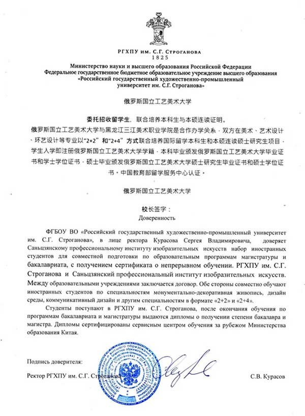 黑龙江三江美术职业学院作为黑龙江省内唯一一所纳入国家招生计划的美术类高等院校,积极响应我国对外开放基本国策,响应国家和黑龙江省委、省政府“教育向北开放新高地”的号召,三江美院与俄罗斯国立工艺美术大学开展合作办学,双方联合培养高中起点本科和高中起点硕士研究生。